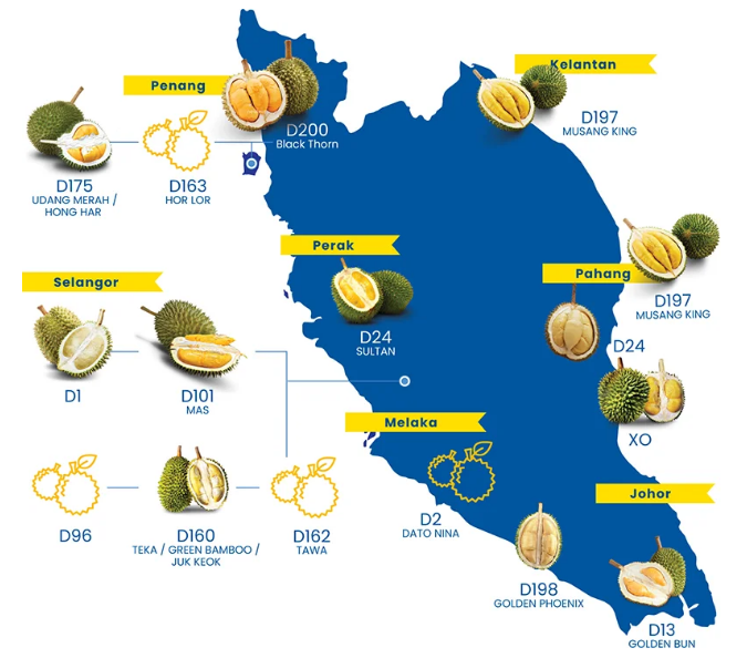 在馬來西亞,大約有200個榴蓮品種有自己獨(dú)特的風(fēng)味和香氣。同時它們也對適宜的生長條件也特定的需要,例如降雨,海拔,溫度和土壤結(jié)構(gòu)。榴蓮僅在成熟季節(jié)才有供應(yīng)那發(fā)生在每年的六月和七月。那個時節(jié)成熟后從樹上自然掉落的榴蓮,往往會含有較多的果肉和更濃郁的香氣。